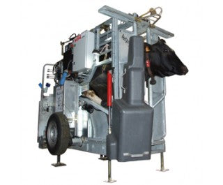 This crush includes the frame and the options as fitted to the tried and tested SA0051 trimming crush. The major difference however is that the drawbar fitted to this crush is the folding type, so that it doesn't need to be removed during operation. This system is patented. The crush has also been provided with a fold-up floor, greatly simplifying cleaning. The box comes standard with a lift and mover system, so that manpower is no longer required to set up the system. The new crush bears the name "Trimmaster RS", RS standing for Rapid Setup, an indication that the conversion from transport setup to operating setup is exceptionally fast.